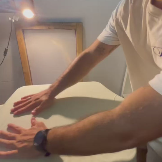 Además, la serigrafía se hace en nuestro pequeño taller en Chiclana de la Frontera, en la playa de La Barrosa, donde usamos tintas veganas y de procedencia local.