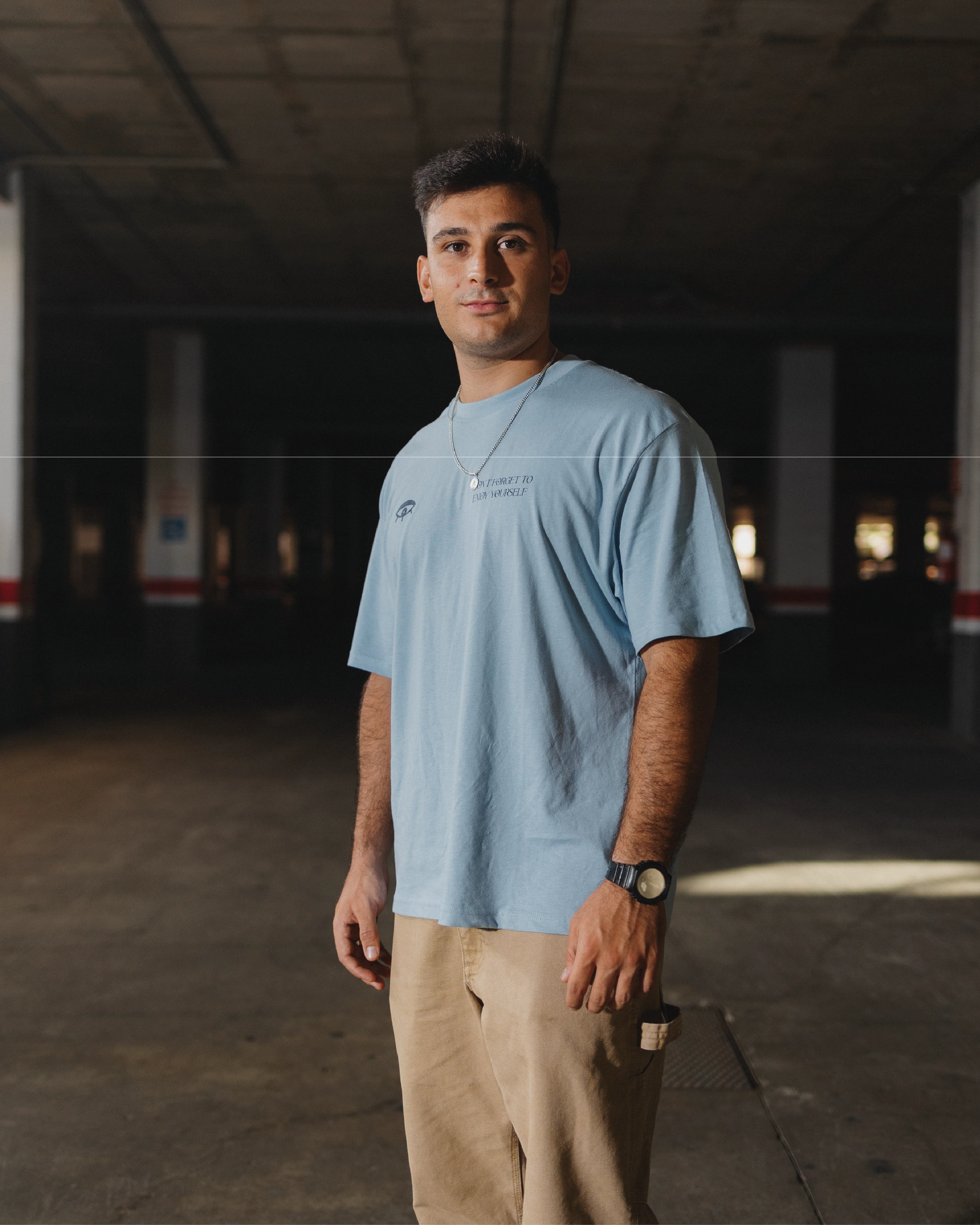 Colección FW24. Su corte holgado y alta calidad de material la hace una camiseta única. Color de camiseta celeste con diseño serigrafiado a mano color azul oscuro. Una camiseta clásica que refleja nuestros valores, manteniendo la esencia como siempre.