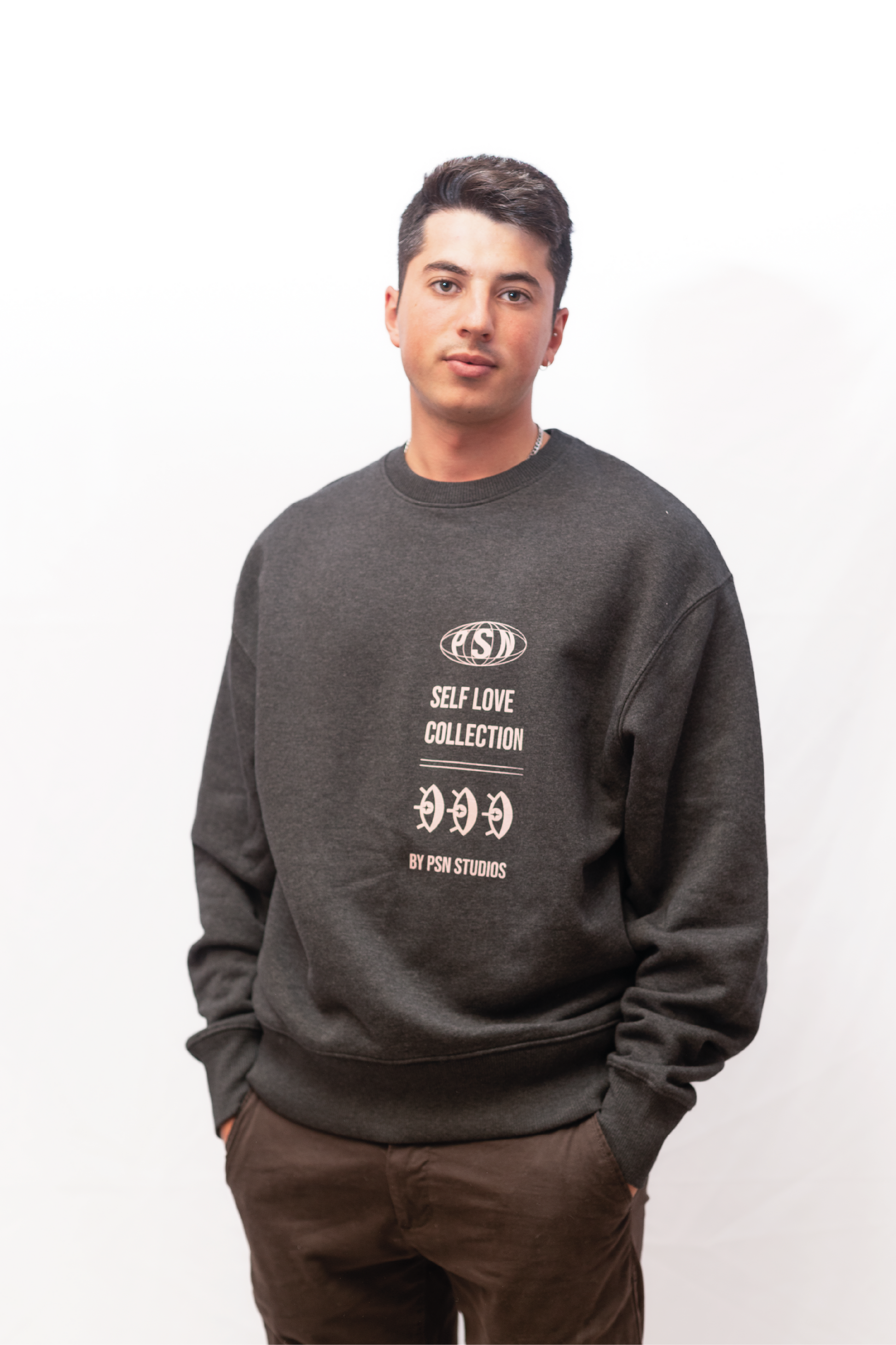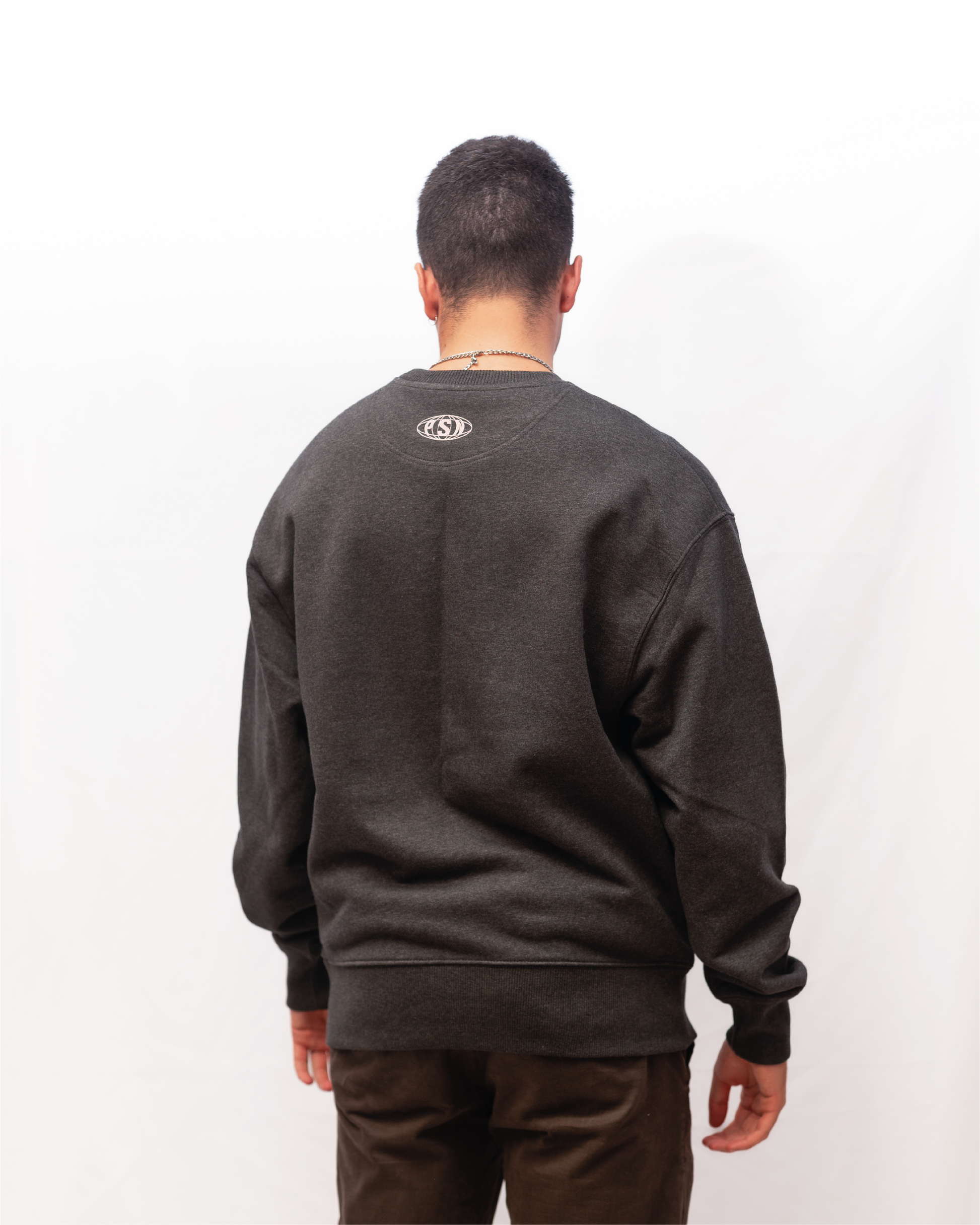 Colección FW24 de Poison. Su corte holgado y alto gramaje la hace una sudadera única. Color de sudadera gris oscuro jaspeado con diseño serigrafiado a mano color rosa pastel. Probablemente la más atrevida y diferente de la colección.