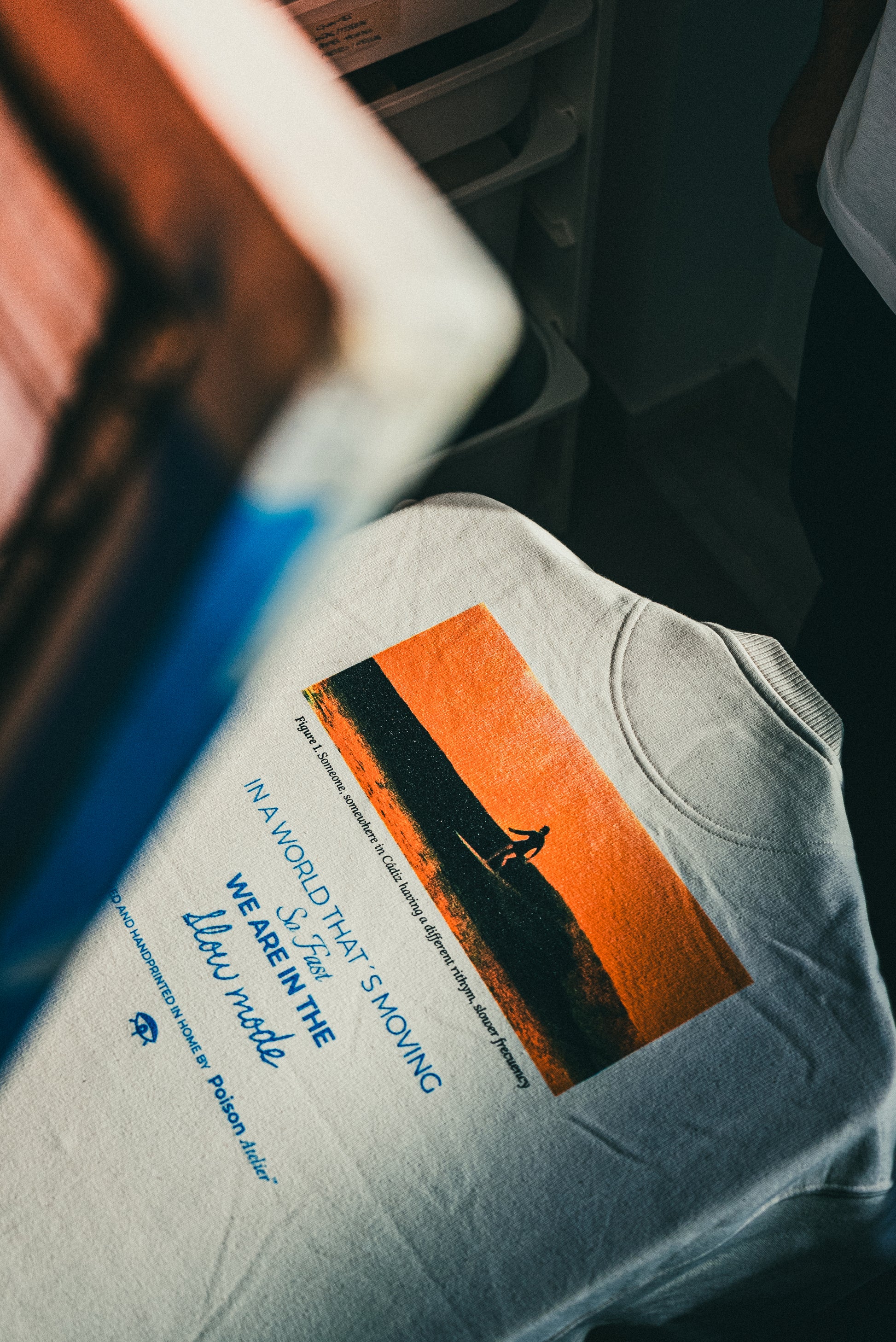Además, la serigrafía se hace en nuestro pequeño taller en Chiclana de la Frontera, en la playa de La Barrosa, donde usamos tintas veganas y de procedencia local.